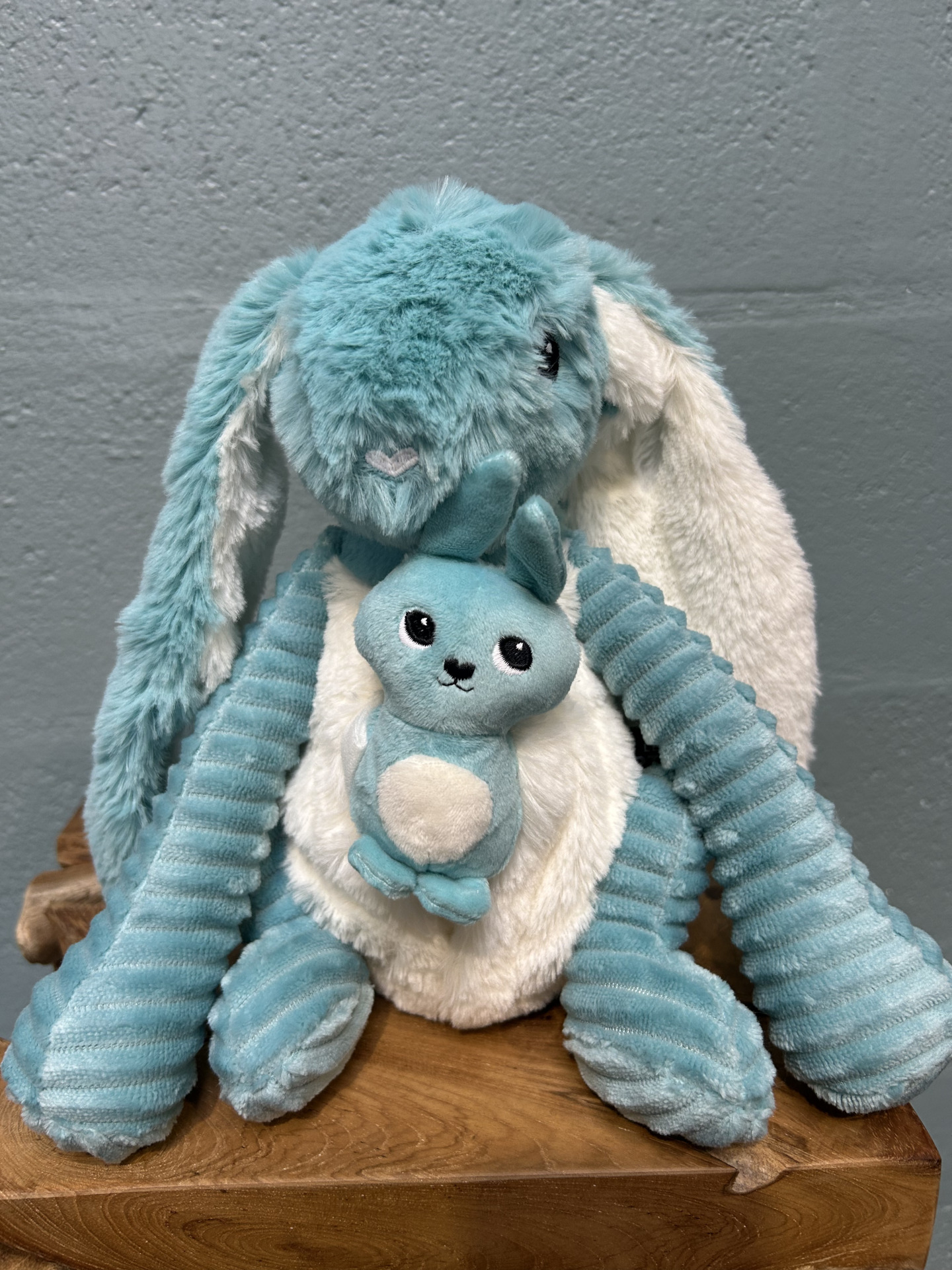 Peluche Toudou le lapin (bleu) – maman et son bébé