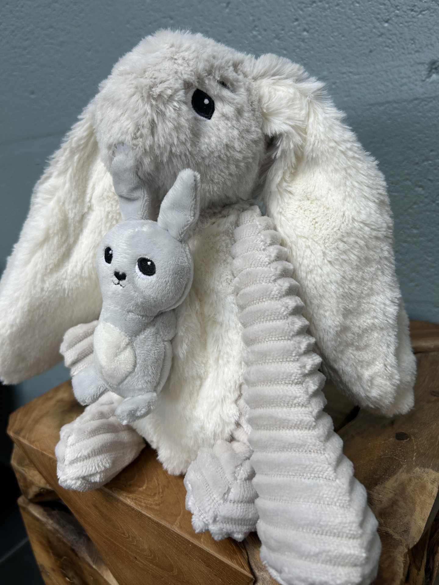 Description : Peluche maman et son bébé caché dans son ventre. Toute douce au toucher, ses bras et ses jambes sont en velours côtelé. Age : 0 + ; rappel de la réglementation : un jouet pour bébé, même homologué dès la naissance, doit toujours être utilisé sous la surveillance d’un adulte Couleur : gris clair.