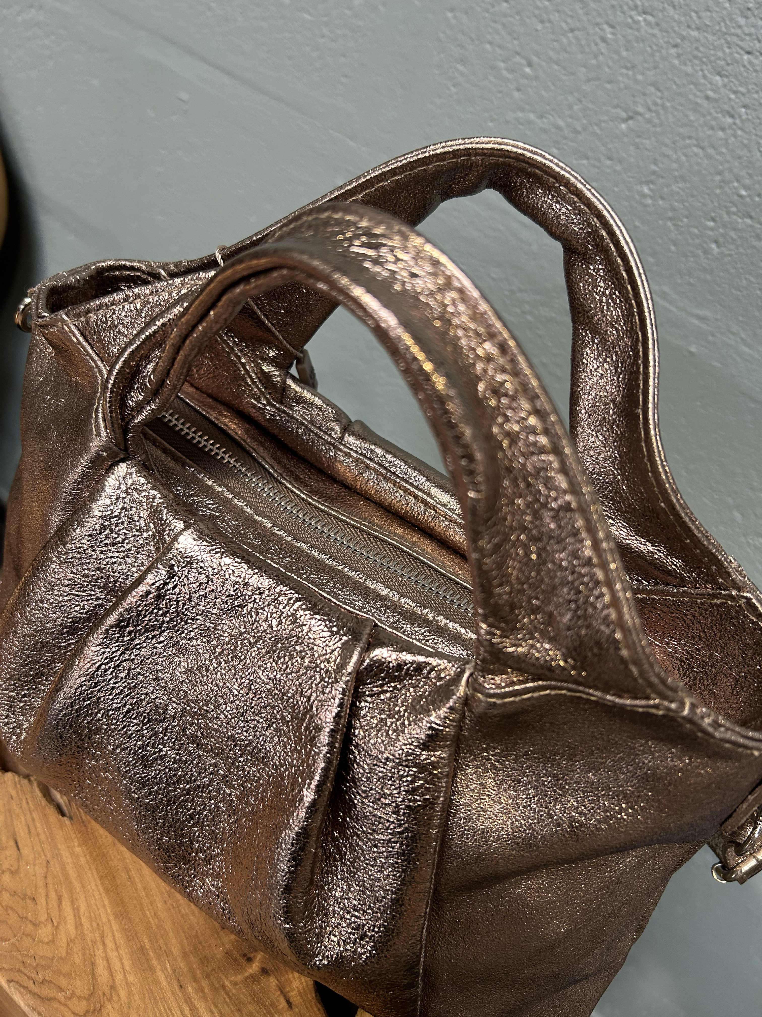 Petit sac à main effet bouffant. Petite pochette à fermeture à l’intérieur du sac. Possibilité de le tenir à la main ou à l’épaule à l’aide de la anse réglable. Couleur : rose gold paillette